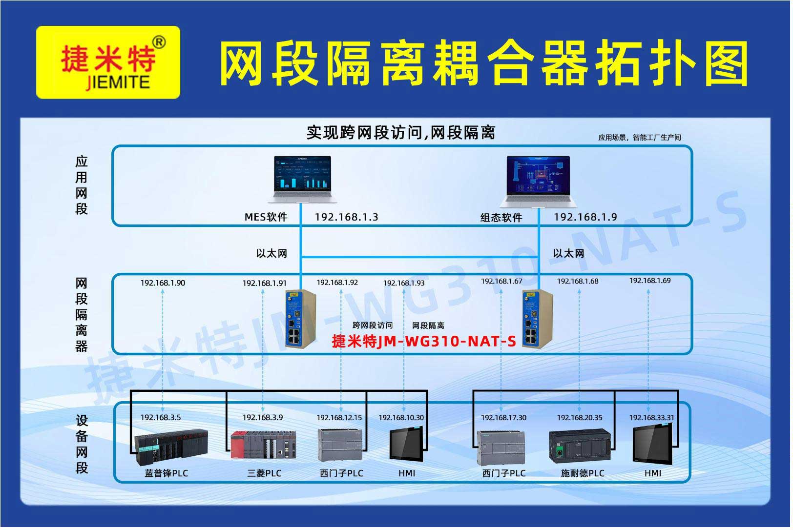JM-WG310-NAT-S网段隔离器适用于生产网络对PLC、HMI、CNC、DCS、MES等网络通讯和数据采集,兼有跨网段隔离和IP转换的功能。JM-WG310-NAT-S同时支持4台以上设备(如PLC、CNC等)网段隔离和NAT转换;车间多个设备,如果有不同网段的IP地址,则可以统一成同一网段的IP地址,进行设备(PLC、CNC)的在线编程、数据采集、远程管理等各种跨网段访问。