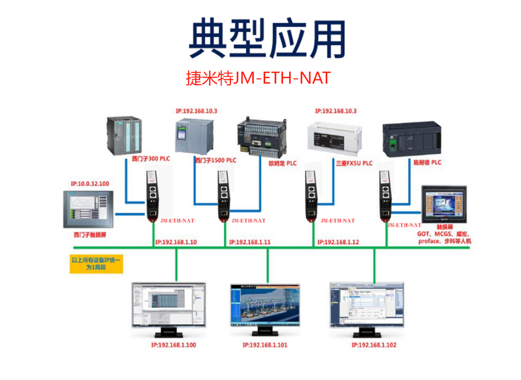在工业自动化场景中,PLC设备常基于以太网、PROFINET、Modbus TCP等协议运行。一旦PLC分处不同网段,因网络隔离限制,设备间无法直接通信,需借助特殊配置或专用设备搭建连接桥梁。捷米特JM-ETH-NAT耦合器便是破局利器,其核心的NAT跨网段地址转换功能,可将LAN1口所连PLC的IP地址与端口号,精准映射至LAN2口指定的任意IP地址及端口号。即使现场设备IP与端口号无法修改,该耦合器也能轻松实现网络穿透,快速打通不同网段间的通信链路,为工业网络通信难题提供高效稳定的解决方案。