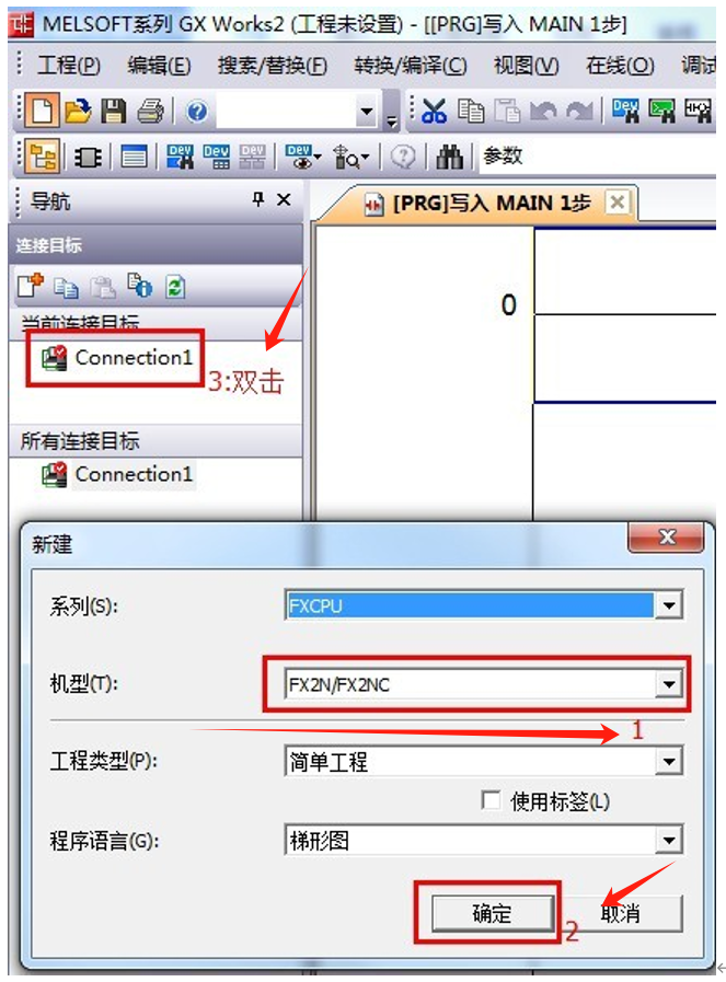1. 新建FX2N/FX2NC工程,双击导航栏中的连接目标:Connection.