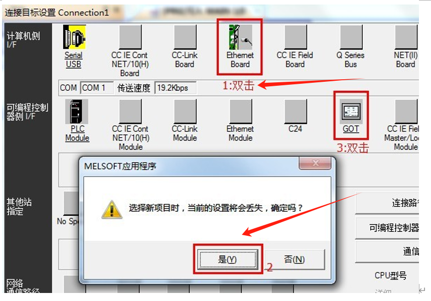 2. 跳出的选项板后,在计算机侧选择双击“EthernetBoard”选项,随后提醒中点击“是”;在可编程控制器侧双击“GOT”;