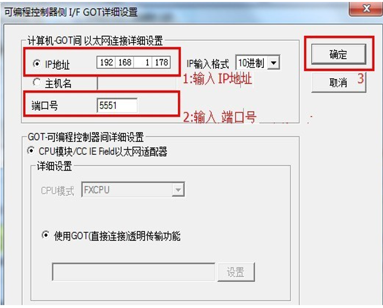 3. 在随后的跳出的设置中,在IP地址中输入模块的IP地址,在端口号中输入模块的端口号。按图中标号依次选择后,最后点击“确认”;