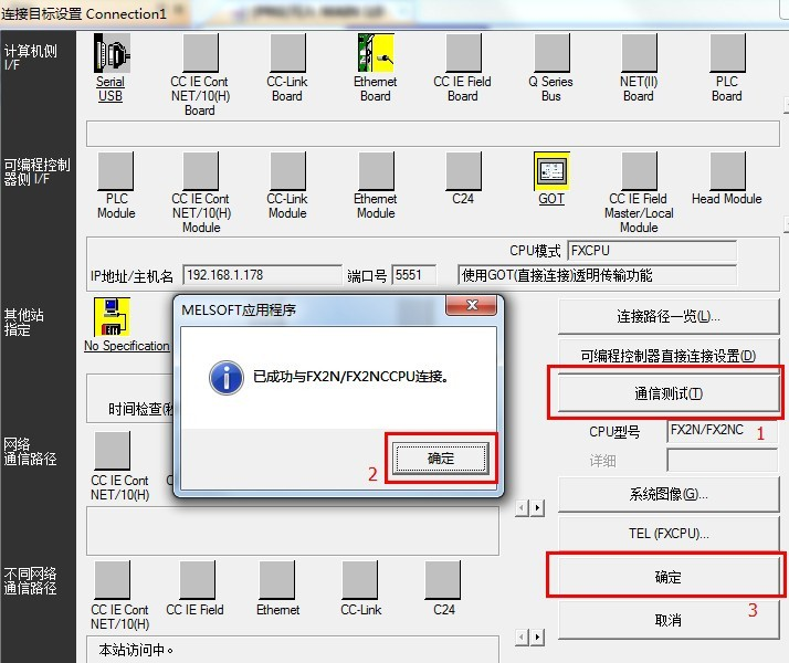 4. 在上述中选择好IP地址后,点击“通信测试”,即可提示与FX2NCCPU连接成功。