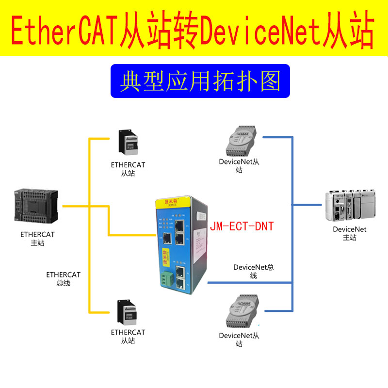 在工业自动化领域,随着技术的发展和生产需求的变化,工厂中常常同时存在基于 DeviceNet和ETHERCAT两种不同通信协议的设备。DeviceNet协议在传统工业现场的设备级网络中应用广泛,众多传感器、执行器等设备依赖其进行通信,能在复杂工业环境下保证可靠的数据传输和分布式控制。而ETHERCAT协议凭借其高速、高精度以及优秀的同步性能,在现代运动控制和对实时性要求严苛的自动化系统中占据重要地位,许多先进的PLC采用ETHERCAT总线作为通信方式,以实现对生产过程的高效精准控制。然而,这两种协议的设备无法直接通信,限制了企业生产系统的集成度和协同工作能力,为解决这一问题,捷米特JM-DNT-ECT网关应运而生。