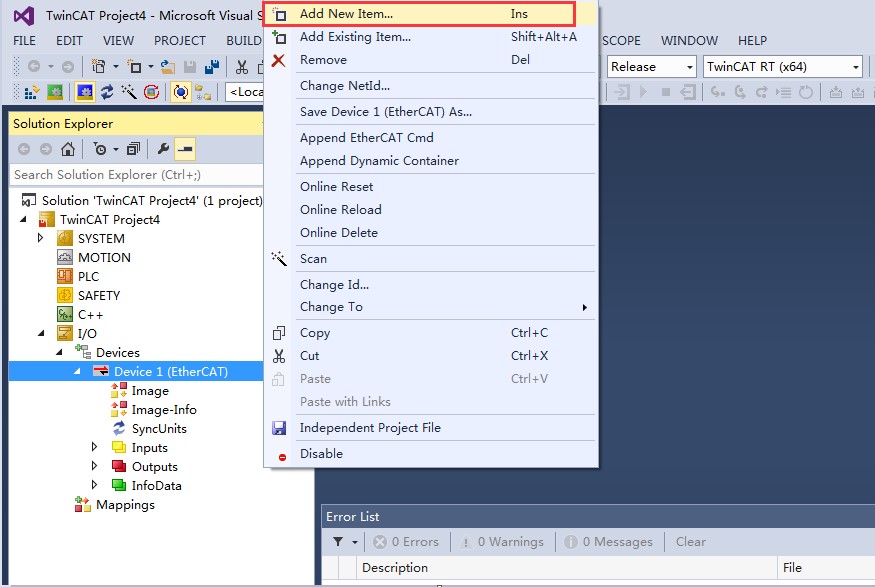19, 主站建立后,在下图中主站 Device 1 的位置,点击鼠标右键 Add New Item,添加 ETHERCAT 从站。
