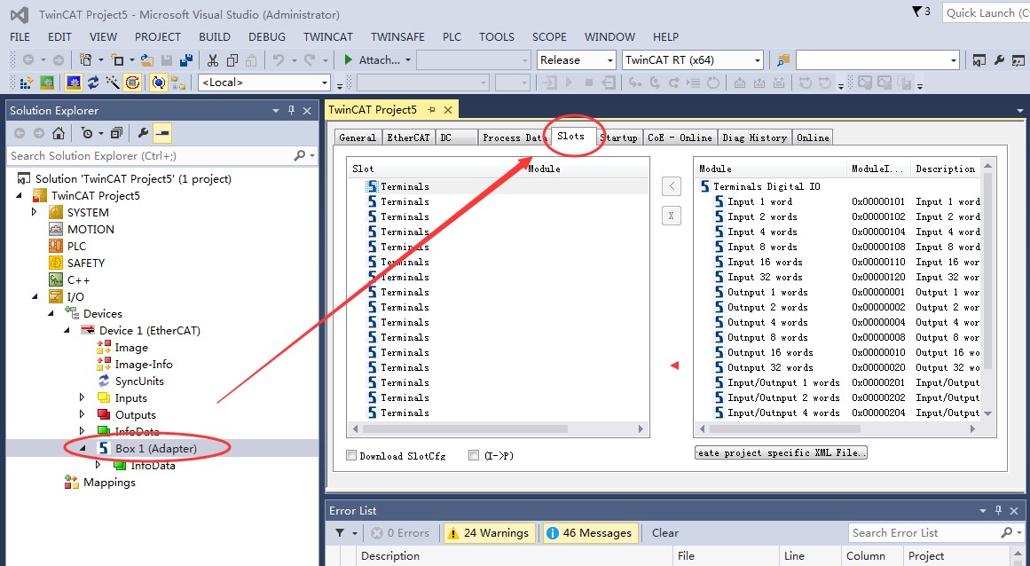 20, 添加后的从站,如下图所示的 Box 1。点击左侧项目树中的 Box 1,在右侧的主视图中,点击 Slots,可以看到网关配置输入输出数据的页面。 如下图所示,在 Slot 列表中,一共可以添加 16 条配置信息。右侧 Module 列表的每一条配置选项,都可以添加到 Slot 中。按照下图 1、2、3 的操作顺序,可以将 Module 添加到 Slot 中。