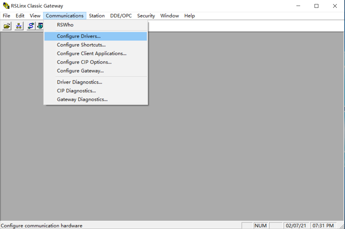 图标,打开软件,在RSLinx软件中配置通讯驱动程序,从 “Communications”(通讯)下拉菜单中选择“Configure Drivers”(配置驱动程序),将出现“Configure Drivers”对话框;(在添加新驱动程序之前,确认满足以下条件:工作站正确配置工作站的IP地址和其他网络参数,正确连接到EtherNet/IP网络)