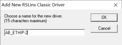将显示“ Add New RSLinx Classic Driver”(添加新RSLinx Classic驱动程序)对话框;可以修改新的驱动程序名称,此例子接受缺省名字(AB_ETHIP-2)然后单击OK;