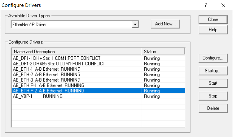 新的驱动程序AB ETHIP - 2 A-B Ethernet RUNNING在Configured Drivers列表里,如下图,点击Close;