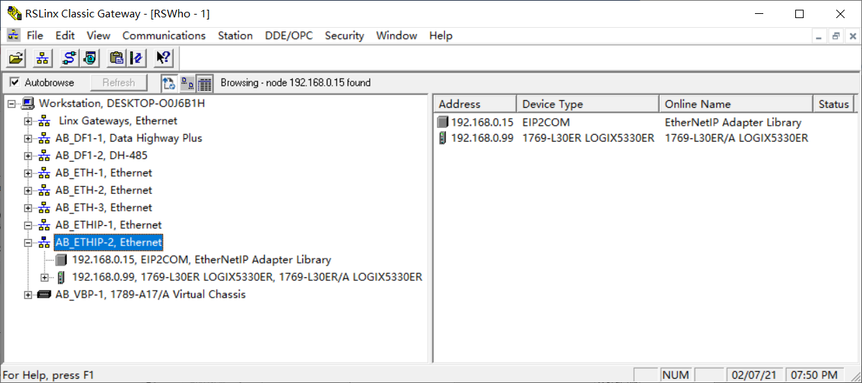 ,弹出RSWho对话框,显示控制网络的树状浏览画面,双击AB_ETHIP-2,Ethetnet验证刚才配置的AB_ETHIP驱动能否与Logix控制器或者网关设备进行通讯;(如果有设备的通讯状态出错,例如一个被认可的设备被拔掉,设备显示带红色X,表明RSWho原先认可,但现在无法找到);
