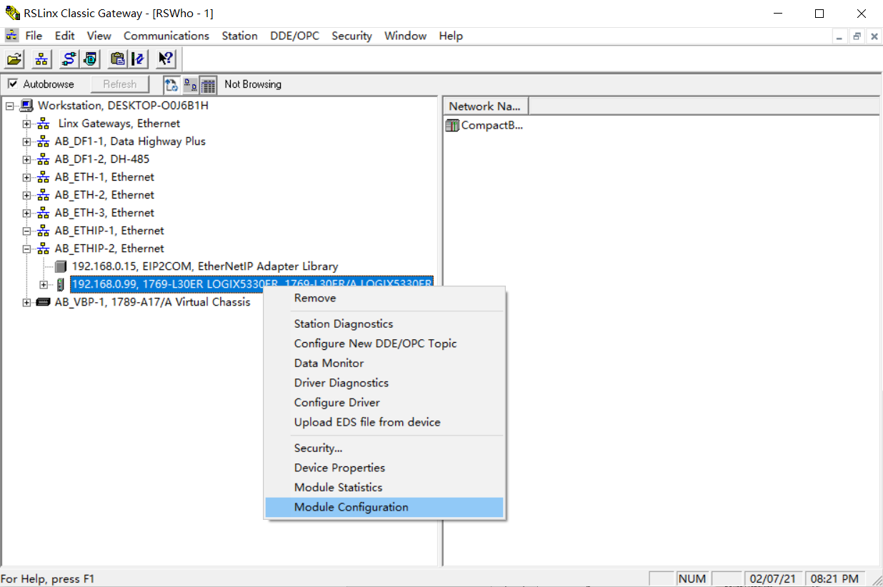 可使用RSLinx软件(或者Studio 5000)修改通讯模块的IP地址,右击EtherNet/IP模块,选择Module Configuration(模块配置)