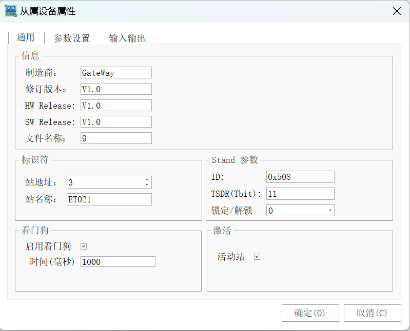 双击Slave图标,弹出“从站设备属性”对话框,在“通用”标签页,包含从站信息、标识符、Stand参数、看门狗等参数;
