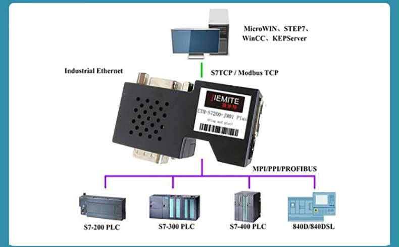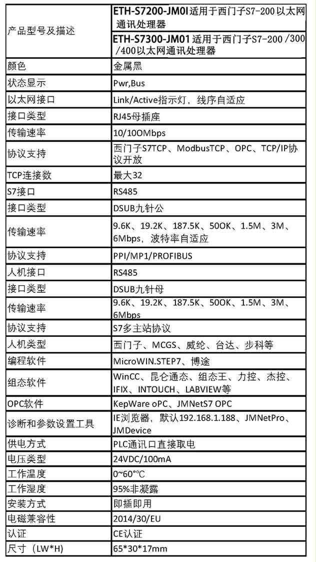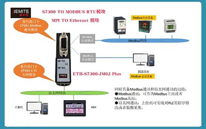 捷米特ETH-S7系列模块适用于西门子S7-200/S7-300/S7-400、SMART S7-200、西门子数控840D、840DSL、ET200、合信、亿维PLC的PPI/MPI/PROFIBUS转以太网。用于西门子S7-200/S7-300/S7-400程序上下载、上位监控、设备联网和数据采集,支持MODBUS TCP/S7TCP,同时支持触摸屏和32台上位机通讯。